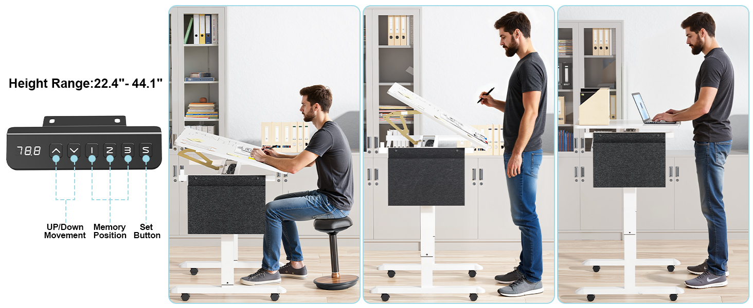 • ELECTRIC HEIGHT ADJUSTABLE DESK – This versatile lift desk allows you to switch effortlessly between sitting and standing from 28″ to 44″. The sturdy steel frame supports up to 176 lbs, making it ideal for the home office, studio, or classroom